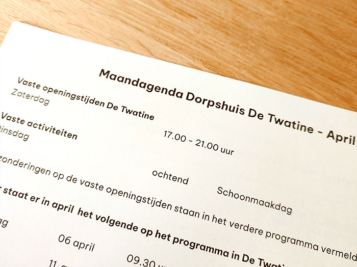 Welkom op de website van dorpshuis De Twatine. Je kunt hier een reservering plaatsen en alle activiteiten in en om De Twatine bekijken. Schrijf je vooral ook in voor de nieuwsbrief om geen enkele update meer te missen uit Hilaard en Hoptille!