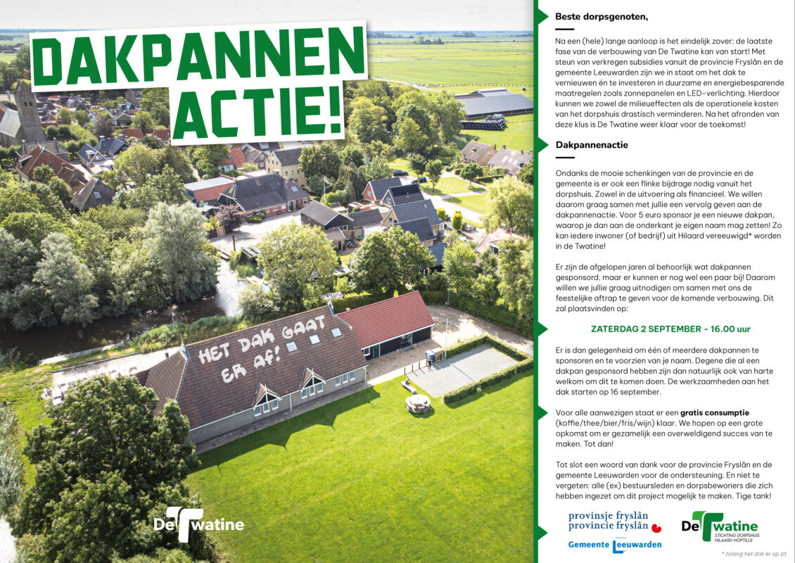 Zet het in je agenda! Zaterdag 2 september is de start van de vernieuwing van het dak! We trappen af met de dakpannenactie: jullie zijn welkom om 16.00 uur voor een drankje en de gelegenheid je naam op een dakpan te zetten!